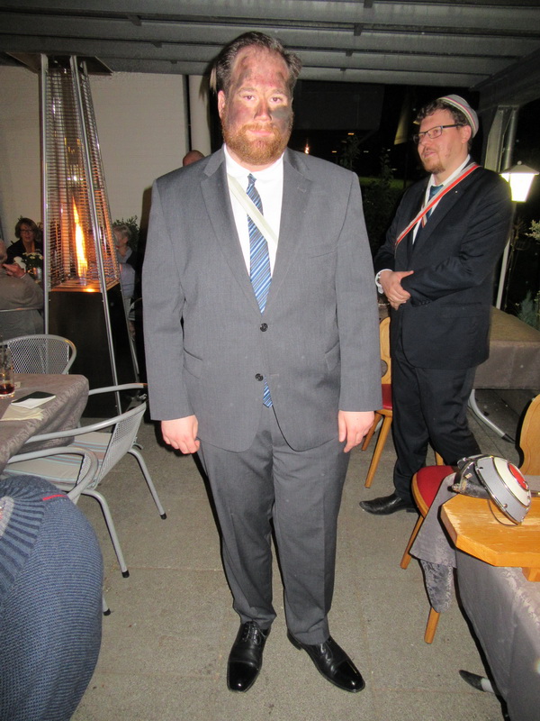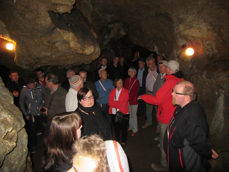 Nach einem reichhaltigen Frühstück besichtigten wir am Samstag, 28. Mai 2016 um 11.00 Uhr Schloss Homburg. Während der Führung wurde die Vergangenheit fast zur Gegenwart, viele Fragen rundeten die interessanten Führung ab. Bei schönen Wetter gingen mehrere Personen zu Fuß zum Hotel, die Mehrheit jedoch bevorzugte die bereitstehenden Taxen. 20 Personen interessierten sich für die Bergische Kaffeetafel und um 14.00 Uhr war großer Hunger angesagt. Reichlich wurde aufgetischt, nach dem Verzehr kamen einige sehr langsam aus den Lokal wieder auf die sonnenüberflutete Terrasse, Rückschlüsse werden hier keine gezogen. Zur besseren Kalorienverwertung starteten wir um 17.00 Uhr zur Besichtigung der permanent 8 Grad kalten Wiehler Tropfsteinhöhle, der Eingang lag dankenswerter weise nur 20 Meter von der Terrasse entfernt. Auch diese Führung war interessant und zur Überraschung der Gäste spendete der AHV eine Runde 'Wagenschmiere' in Anlehnung an die in Wiehl beheimatete Bergische Achsenfabrik, ein Getränk aus Martini und Williams Christ. Wieder auf der Sonnenseite bei 25 Grad Celsius wurden sofort alle Jacken und Pullover ausgezogen. Gegen 19.00 Uhr startete auf der Terrasse das Grillbuffet, das nichts zu wünschen übrig lies. Eine Überraschung hatten die Aktiven noch im Köcher: Kraßfux Wallace wurde gebrandet. Die Brandungsaufgabe war bereits nachmittags schnell aus dem Hut gezaubert worden. Parallel zu unserer Veranstaltung fand eine Hochzeit statt und Wallace musste die Braut zum Tanz auffordern. Nach bestandener Prüfung wurde ihm das grau-rote Band verliehen. Um 0.00 Uhr gratulierte und sang die Corona unserer FS Lindy zum Geburtstag. Die Aktiven gratulierten mit Chemnitzer Schokospezialitäten und einer Kerze. Als Dank spendete Lindy eine Runde edlen Getränkes.
